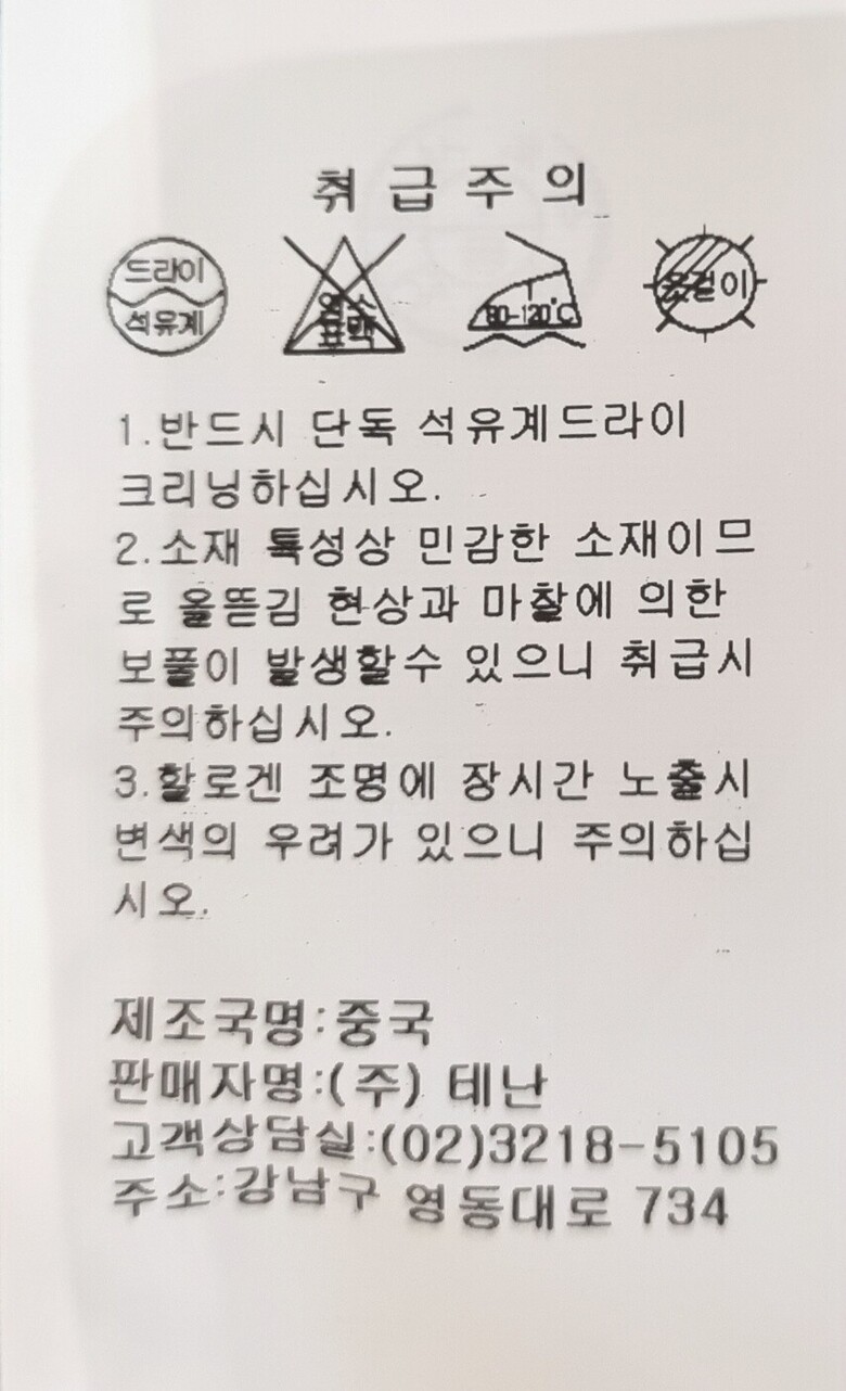 6. 세탁방법 및 취급시 주의사항 1.반드시 단독 석유계 드라이크리닝하십시오. 2.소재 특성상 민감한 소재이므로 올뜯김현상과 마찰에 의한 보풀이 발생할 수 있으니 취급시 주의하십시오. 3.습윤시 마찰에 의한 이염현상에 주의하십시오.