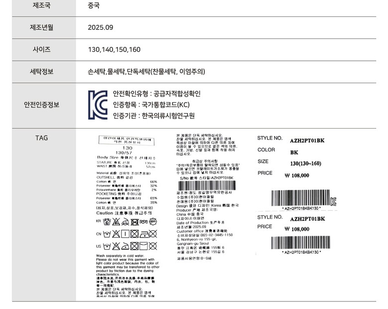 5. 재질 (섬유의 경우 혼용률) | 겉감 면 66% 폴리에스터 32% 폴리우레탄 2% / 주머니감 폴리에스터 65% 면 35% |