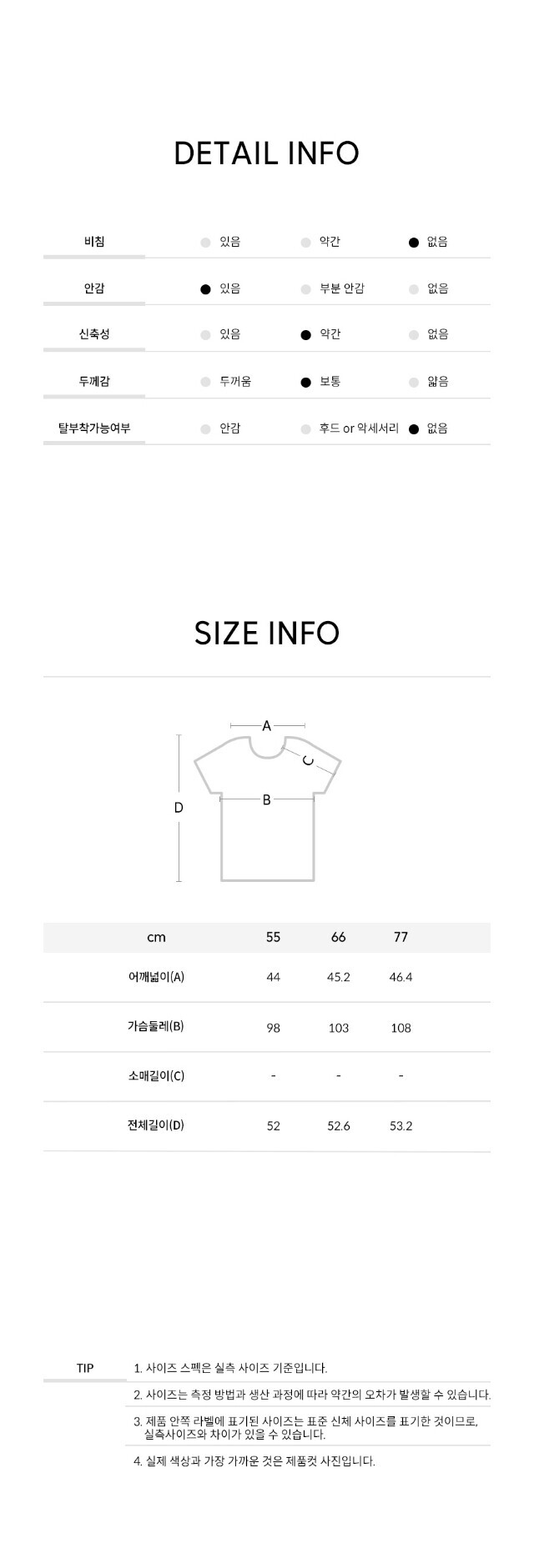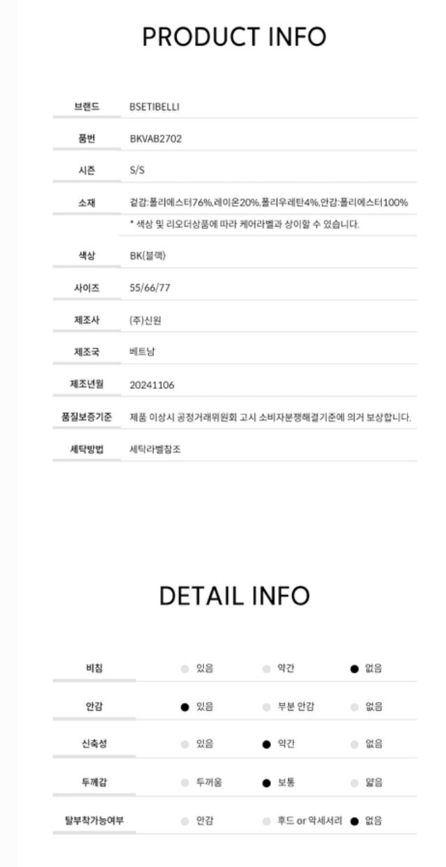 | 1. 제품 소재 (섬유의 조성 또는 혼용률을 백분율로 표시, 기능성인 경우 성적서 또는 허가서) | 상품상세참조 |