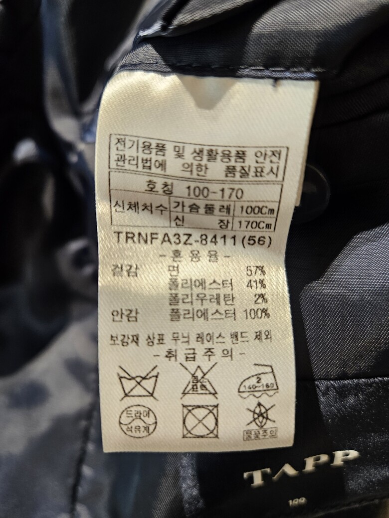 세탁방법 및 취급시 주의사항 : 드라이클리닝을 해야 하며, 용제의 종류는 석유계에 한한다.