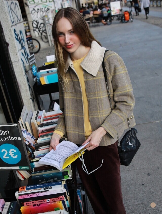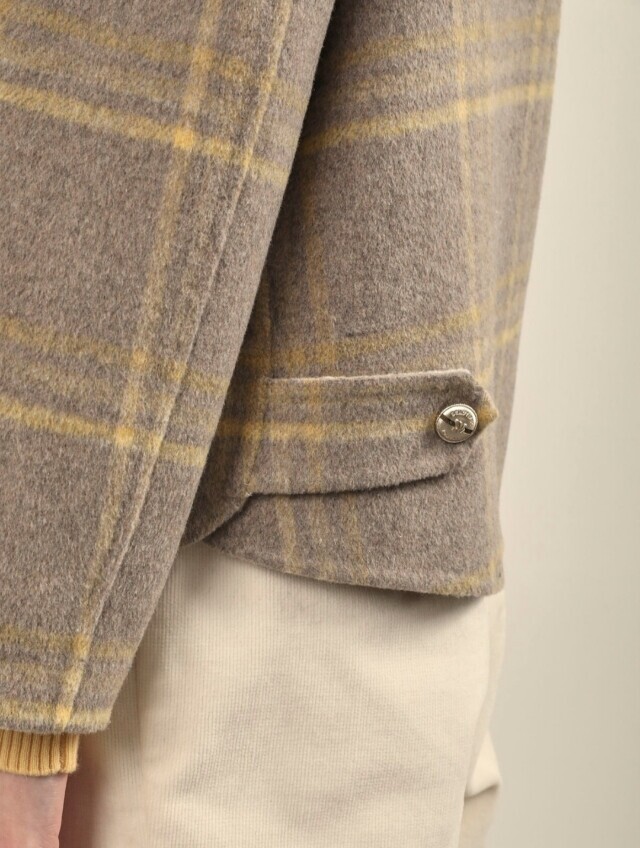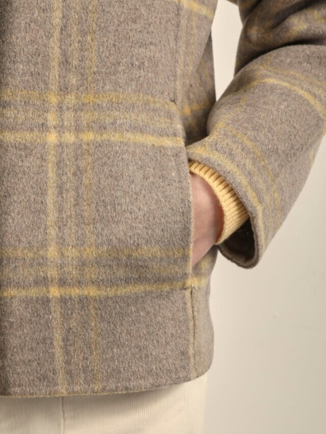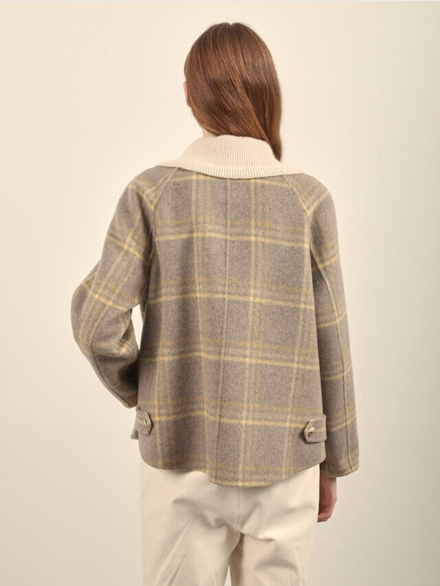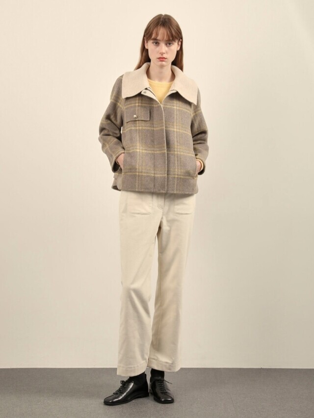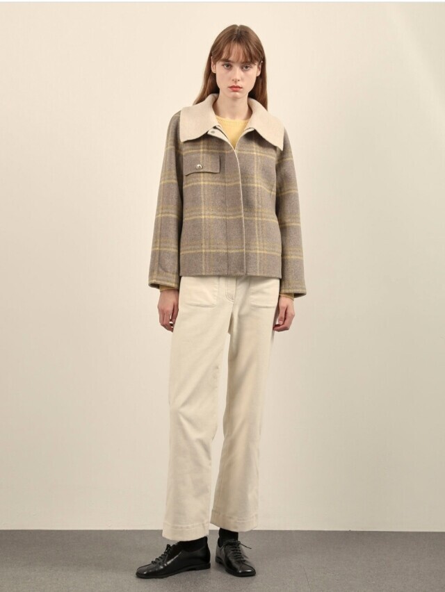 단기장의 살짝 A라인으로 떨어지는 실루엣과 지퍼 여밈이 캐주얼한 느낌을주고 탈부착 가능한 배색컬의 니트카라를 함께 구성하여 활용도를 높였습니다