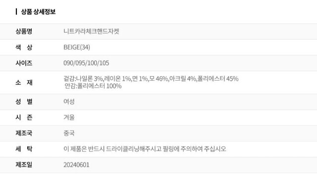 | 6. 세탁방법 및 취급시 주의사항 | 상품상세참조 |