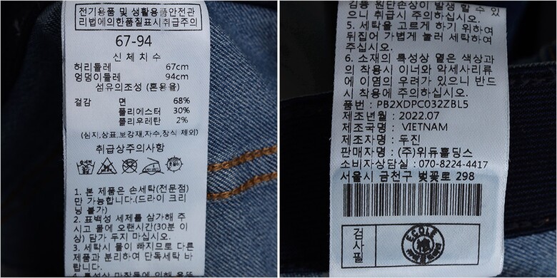 1. 제품 소재 (섬유의 조성 또는 혼용률을 백분율로 표시, 기능성인 경우 성적서 또는 허가서) | 겉감-면68% 폴리에스터30% 폴리우레탄2% |