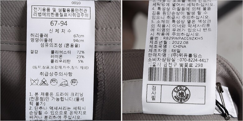 | 1. 제품 소재 (섬유의 조성 또는 혼용률을 백분율로 표시, 기능성인 경우 성적서 또는 허가서) | 겉감-폴리에스터72% 폴리우레탄5% 레이온23% |