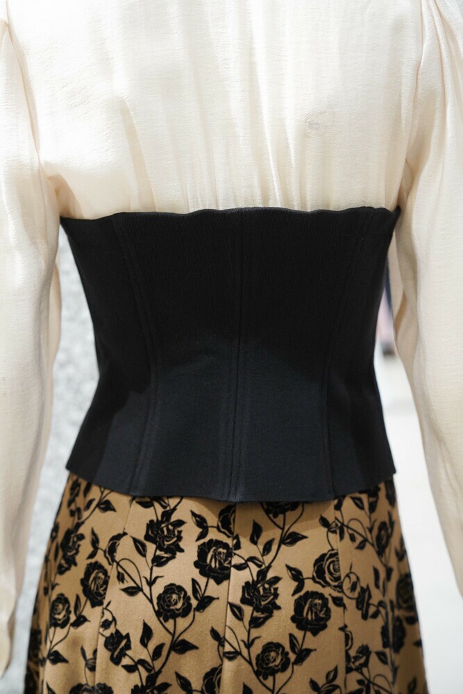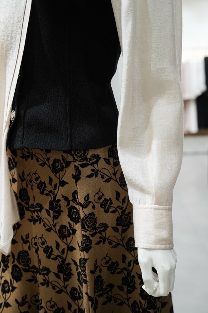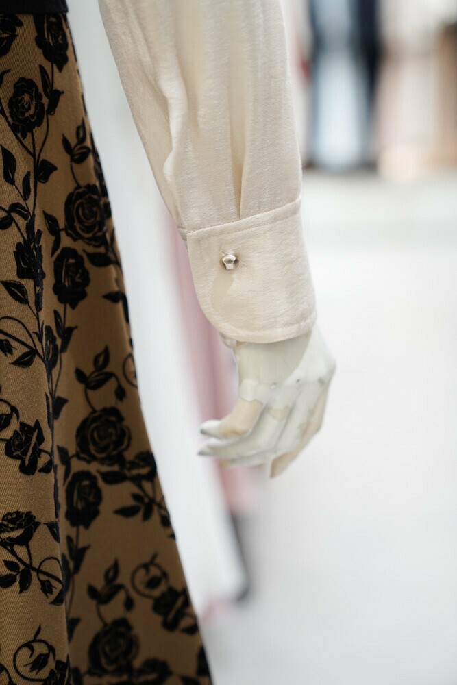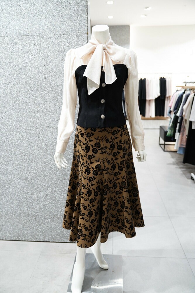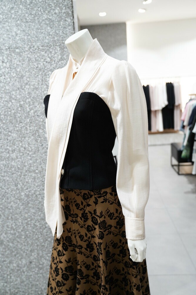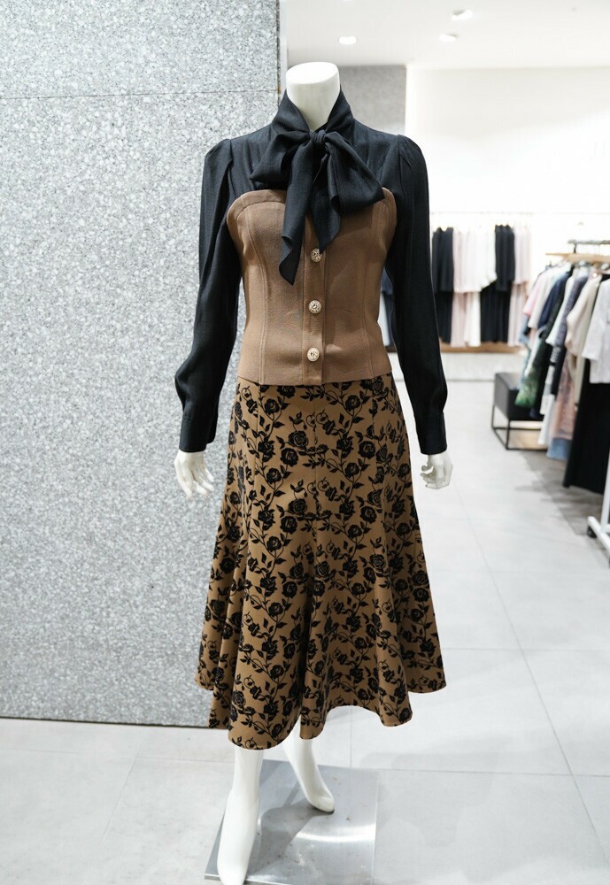 니트배색과 진주 포인트로 몸매를 슬림하게 보여줍니다.