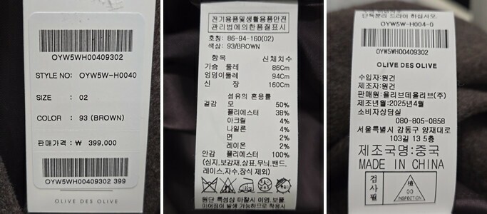 | 1. 제품 소재 (섬유의 조성 또는 혼용률을 백분율로 표시, 기능성인 경우 성적서 또는 허가서) | 겉감:모50%폴리에스터38%아크릴4%나일론4%면2%레이온2%,안감:폴리에 |