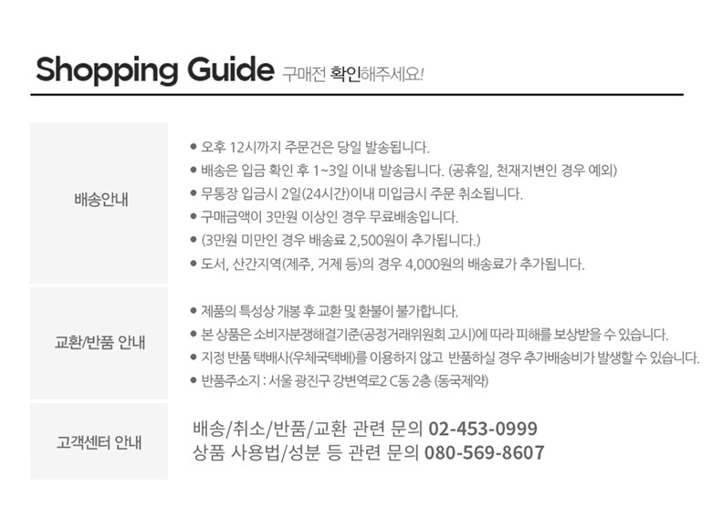 상품불량에 의한 반품, A/S, 품질보증 및 피해보상 등에 관한 사항은 소비자 분쟁해결기준(공정거래위원회 고시) 구매자가 미성년자인 경우에는 상품 구입시 법정대리인이 동의하지 아니하면 미성년자 본인 또는 법정대리인이 구매취소 할 수 있습니다. |