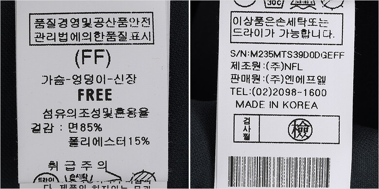 1. 제품 소재 (섬유의 조성 또는 혼용률을 백분율로 표시, 기능성인 경우 성적서 또는 허가서) 겉감-면85% 폴리에스터15%