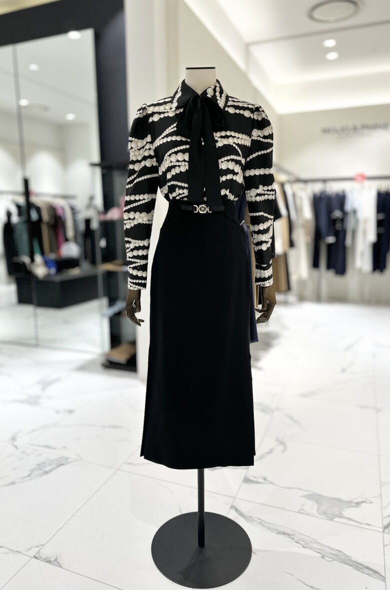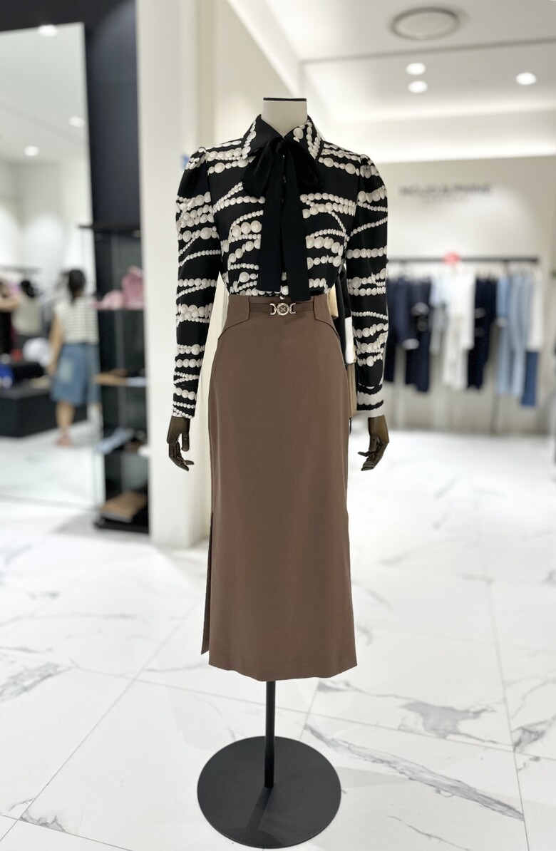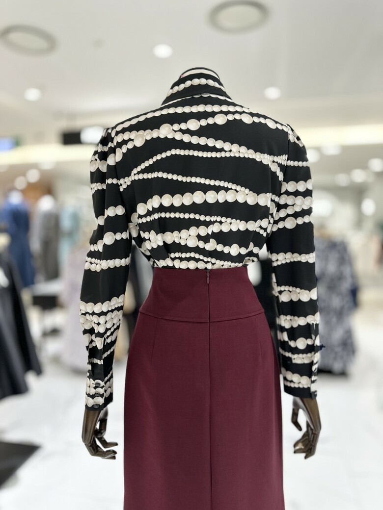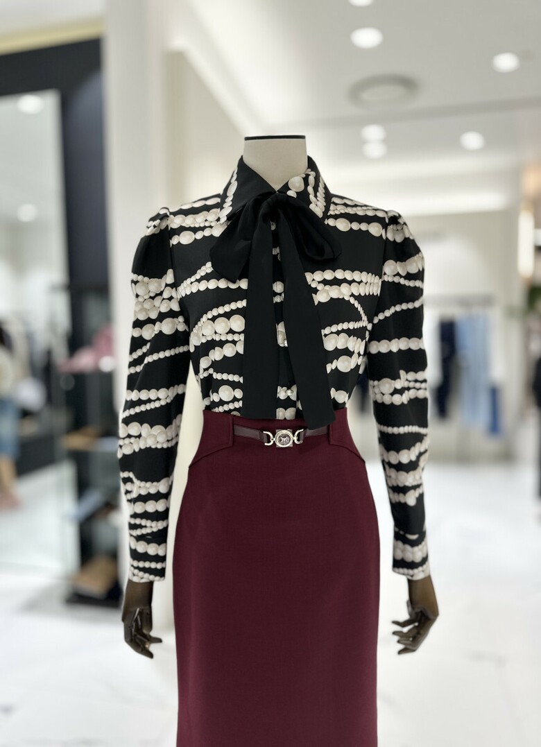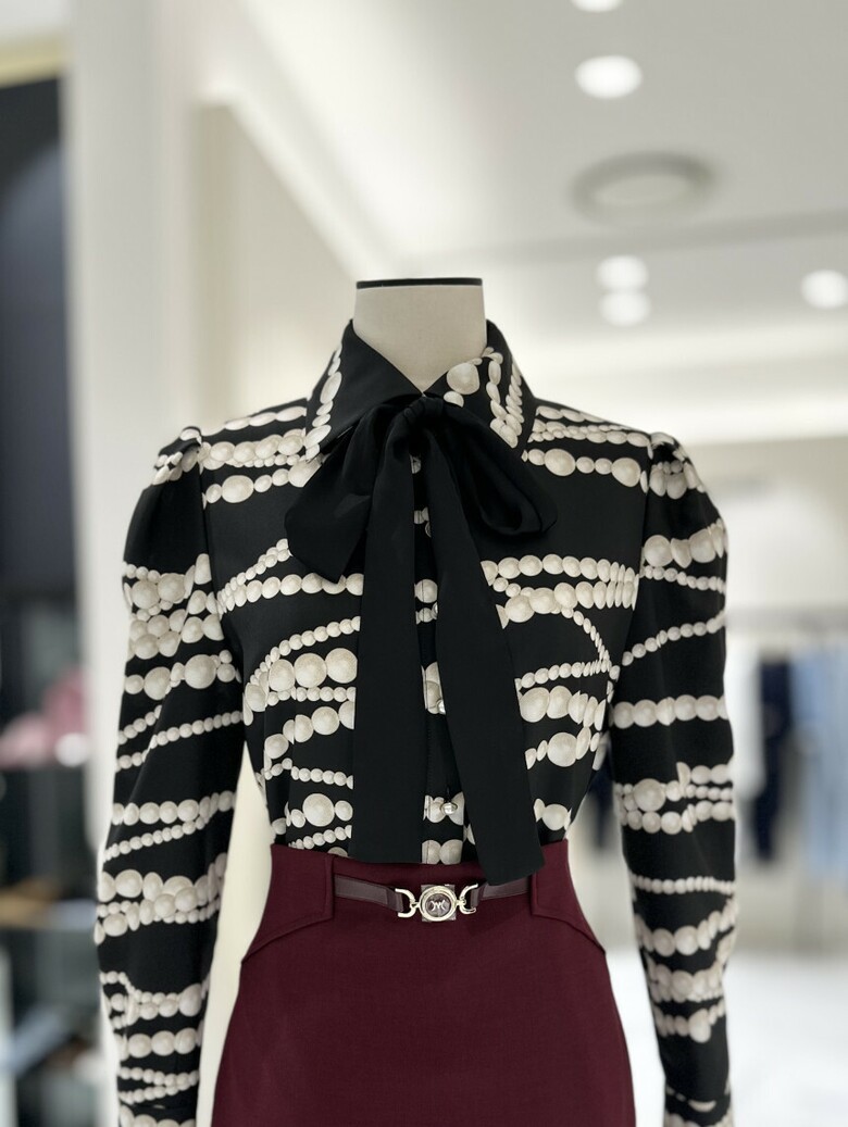 모조에스핀 진주 프린트 타이넥 블라우스 J243MSC019