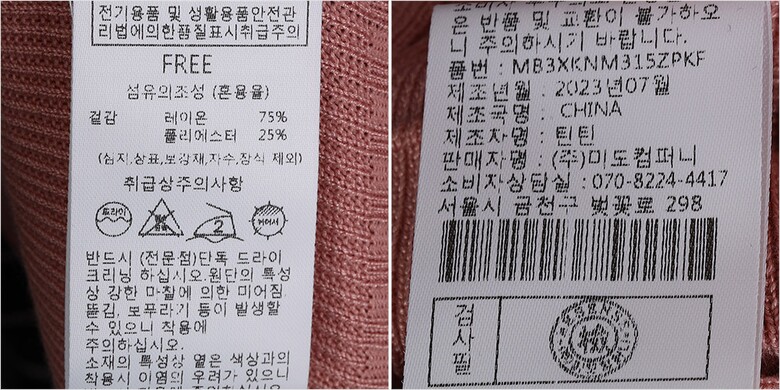 | 1. 제품 소재 (섬유의 조성 또는 혼용률을 백분율로 표시, 기능성인 경우 성적서 또는 허가서) | 겉감-폴리에스터25% 레이온75% |