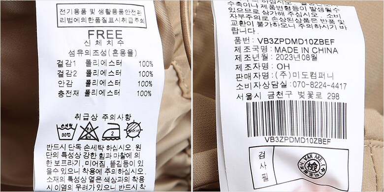 | 1. 제품 소재 (섬유의 조성 또는 혼용률을 백분율로 표시, 기능성인 경우 성적서 또는 허가서) | 겉감-폴리에스터100% 안감-폴리에스터100% 충전재-폴리에스터100% |