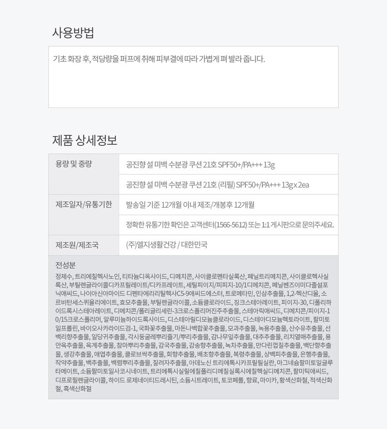 | 4. 사용방법 | 기초 화장 후, 적당량을 퍼프에 취해 피부결에 따라 가볍게 펴 발라 줍니다. |
