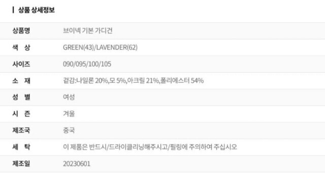 | 1. 제품 소재 (섬유의 조성 또는 혼용률을 백분율로 표시, 기능성인 경우 성적서 또는 허가서) | 상품상세참조 |