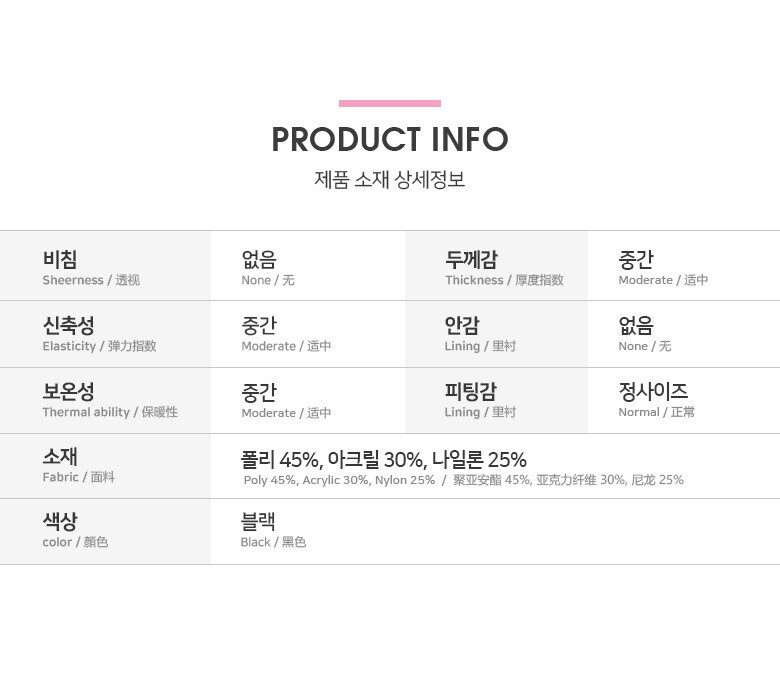 | 1. 제품 소재 (섬유의 조성 또는 혼용률을 백분율로 표시, 기능성인 경우 성적서 또는 허가서) | 별도표시 |