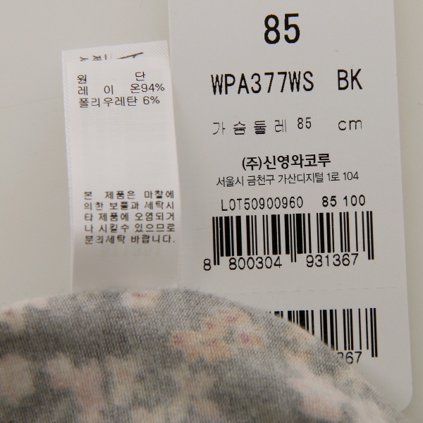 | 6. 세탁방법 및 취급시 주의사항 | 1.속옷은 중성세제를 이용하여 단독 손세탁하시기를 권합니다2.세탁전 제품에 부착된 라벨의 세탁표시를 확인 바랍니다3.세탁시 세제를 세탁물에 직접뿌리는 것은 금물입니다4.건조기 사용을 금합니다 |
