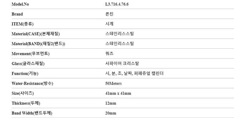 | 7. 주요 사양 | 스테인리스스틸 시계 쿼츠 |