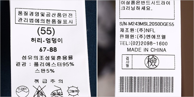 | 1. 제품 소재 (섬유의 조성 또는 혼용률을 백분율로 표시, 기능성인 경우 성적서 또는 허가서) | 겉감-폴리에스터95% 스판5% |